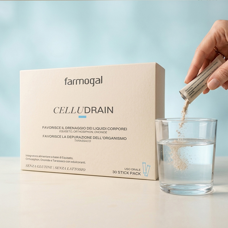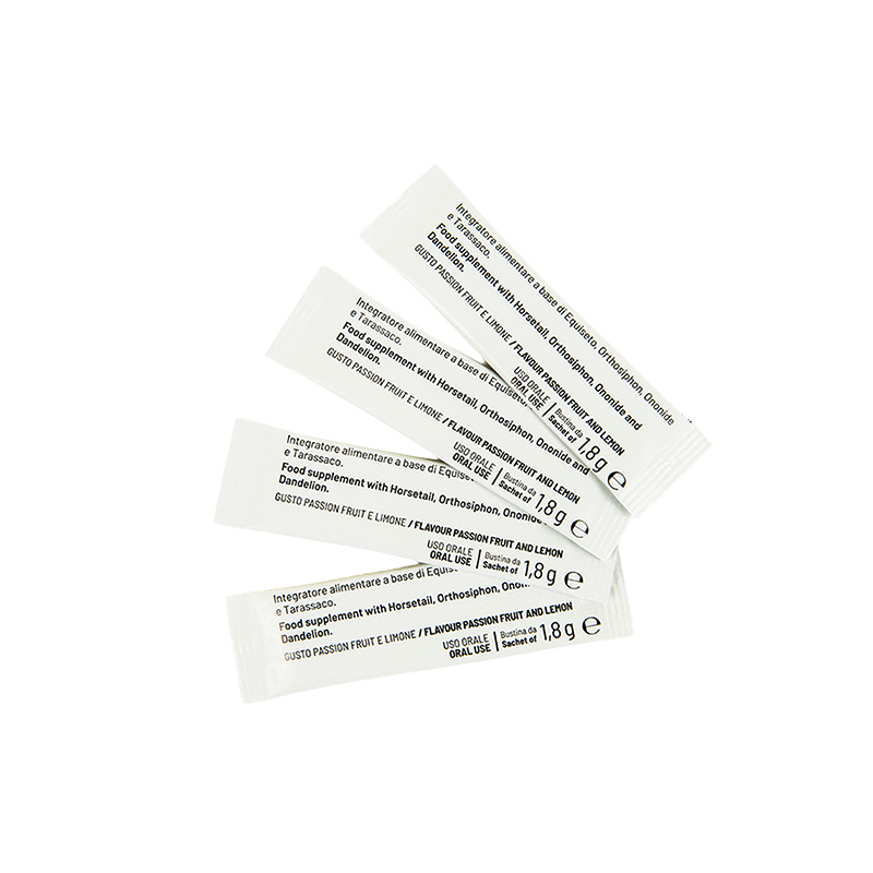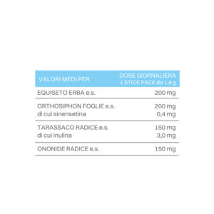 Integratore alimentare con edulcoranti a base di Equiseto e Orthosiphon che favoriscono il drenaggio dei liquidi corporei, Ononide che favorisce la funzione epatica e Tarassaco che favorisce le funzioni depurative dell’organismo.