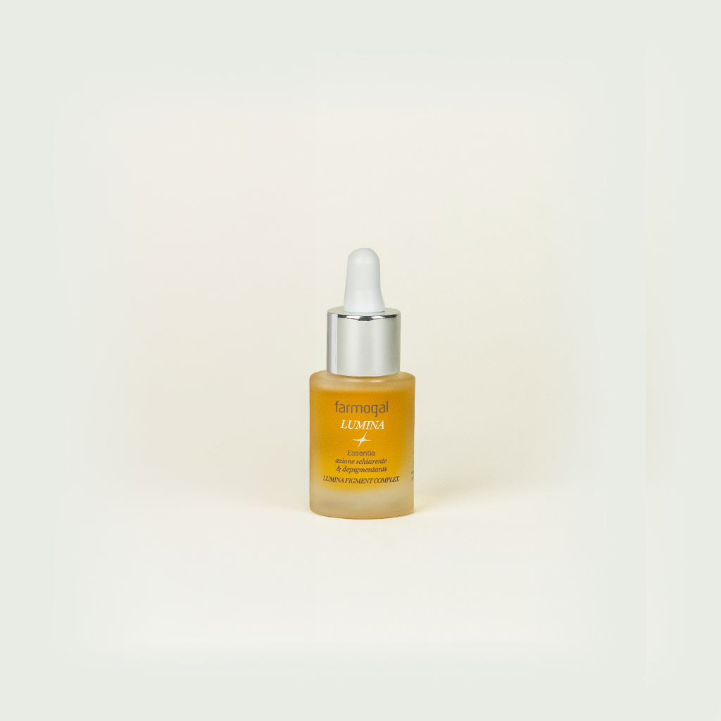 Azione schiarente & depigmentante. Un concentrato di principi funzionali in formula anidra stabilizzata. Promuove un’azione illuminante, antiossidante ed emolliente. Contiene Lumina Pigment Complex, un complesso brevettato di attivi selezionati per rallentare la melanogenesi e inibire la formazione di macchie scure.